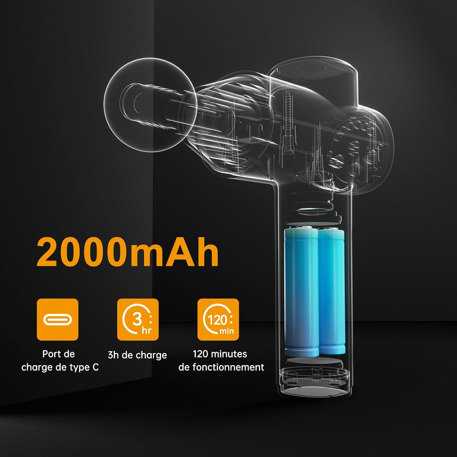 Le pistolet est livré avec 4 à 6 têtes interchangeables, chacune conçue pour cibler un groupe musculaire précis :
